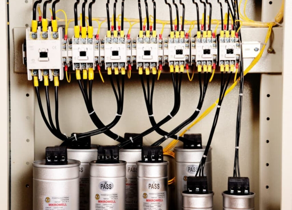 Microprocessor-based Power Factor Correction relay controlled the switching of Parallel connected Power capacitor which rated 2.5kVAr, 5kVAr,7.5kVAr,10kVAr,12.5KVAr, 15kVAr,20kVAr, 25kVAr, 50kVAr…and more, corresponding magnetic Contactor for suitable stepping of the capacitor Bank, sometimes also used detuned reactor with series in capacitor for harmonic filtrations.